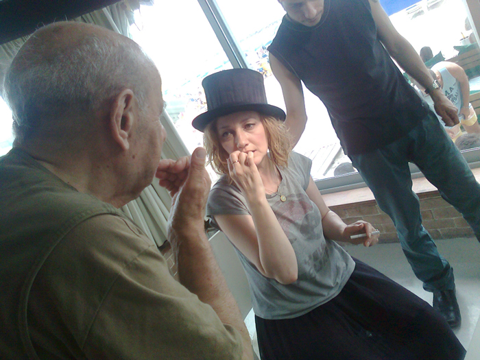 הזקן אינו משיב. הוא מביט באשה, שמוציאה מתיקה מכשיר הקלטה קטן ופנקס רשימות.