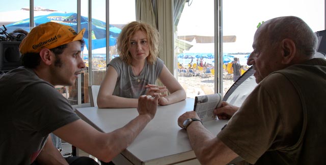 איש זקן יושב אל השולחן מול זגוגית חלון שמעברה חוף הים. הוא מביט בשעונו כמי שמחכה למישהו. המלצרית (השחקנית ים ברוסילובסקי) טורחת מסביב, מסדרת כיסאות ומפנה כלים מהשולחנות. היא משגיחה בזקן היושב לבדו.