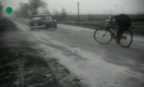 בסרט 'תאונה' יש קטע שבו קופר, ובתוכה הזוג הצעיר המטייל בה, עוקפת אשה כפרייה רכובה על אופניים. המכונית המשתוללת נוגעת-כמעט בכפרייה וזו נופלת מאופניה, כדי המתכת הגדולים המועמסים משני צידי האופניים מתגוללים אל האספלט, חלב נשפך מתוכם. צילמנו את הקטע ביום שבו השחקן אנדרה, נהג ראלי מנוסה, לקח חופש כי יומיים ירד גשם שוטף, וגם השחקנית ברברה נסעה הביתה. דווקא כשהם עזבו את המלון, הגשם פסק. באין ברירה החלטתי להמשיך את ההפקה ולצלם את הקטע בלי השחקנים. במקום אנדרה נהגתי אני את הקופר, ולצידי, במקום ברברה היפה – ישבה עוזרת הפקה. יש להוסיף כי צלם הסרט, סטניסלב (סטאשק), שמתחילת הצילומים דרש לשחק את הכפרייה הרוכבת, זכה סוף-סוף להגשים את רצונו. הוא השאיר את מסרטתו לאיש הקול, שהיה מחוסר תעסוקה, לבש בגדי פולקלור (חצאית ארוכה בהדפס של פסים צבעוניים), עטף ראשו במטפחת, התיישב על האופניים – ונסע.