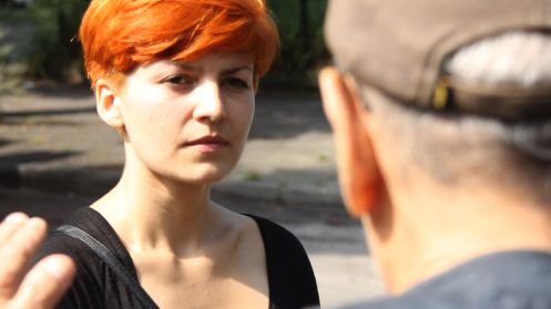 פליציה ט' (בגילומה של יבגניה דודינה) ובעלה (השחקן אולק מיצנר) מתחבקים במפתן הדלת ומדברים ביידיש כדי שהילדים לא יבינו.