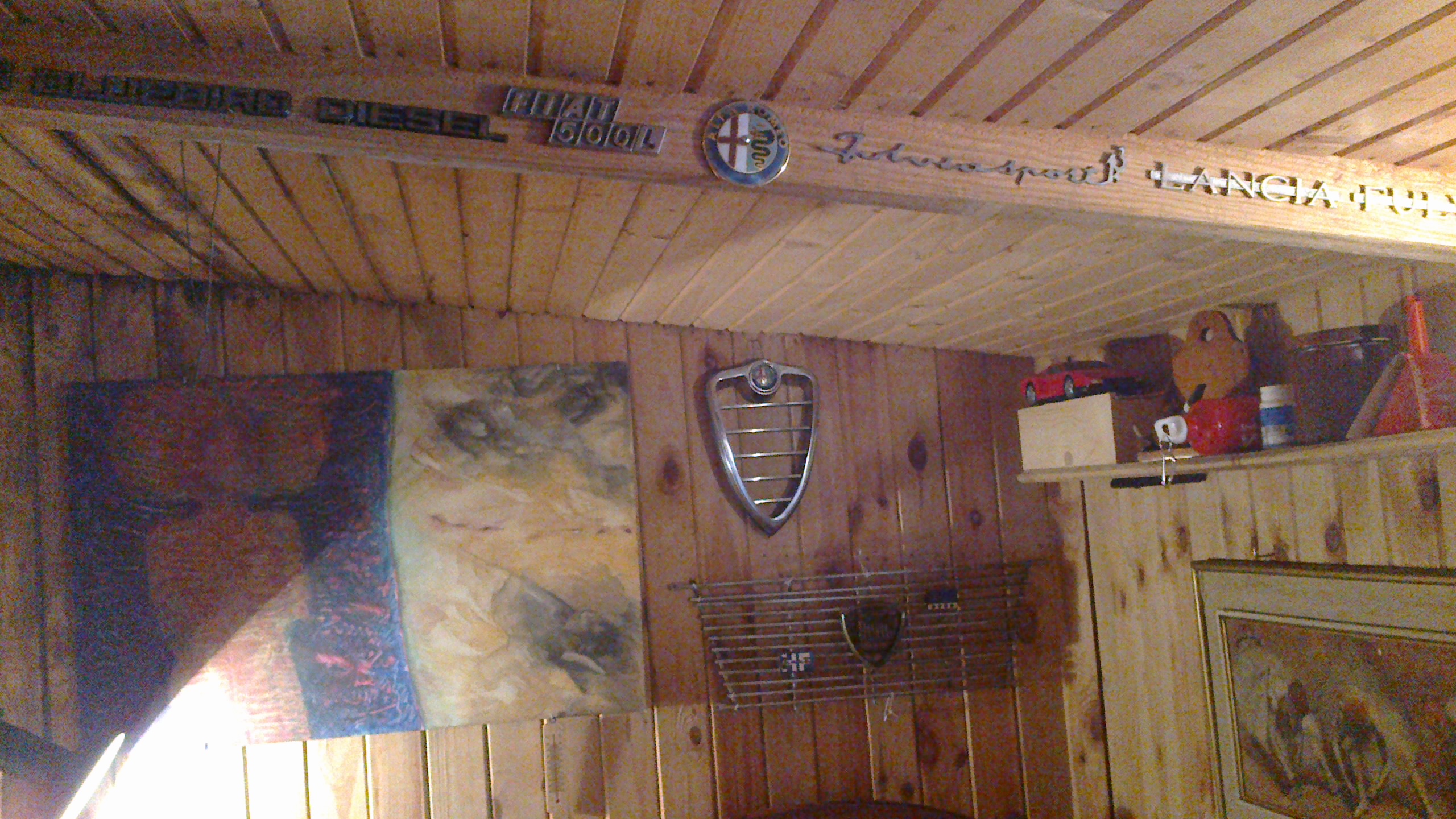 קיר בצריף היצירה. גריל הניקל הקדמי של ג'ולייטה ספיידר הוותיקה (המתנוסס במרכז התצלום) יפה יותר מההצעה המודרנית באלפא 4C