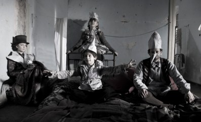 והשמחה מאין תימצא: הסצנה של חגיגת הפורים המשפחתית בגטו ורשה, 1941. יבגניה דודינה כפליציה ט' (האֵם), אולק מיצנר כאבא, והשחקנים הצעירים לָאוּרָה ואוסקר המגלמים את אירנה ומיכאל. אווירת העצב העולה מן התצלום הולמת, במבט לאחור, את גורלה העגום של הפקת הסרט